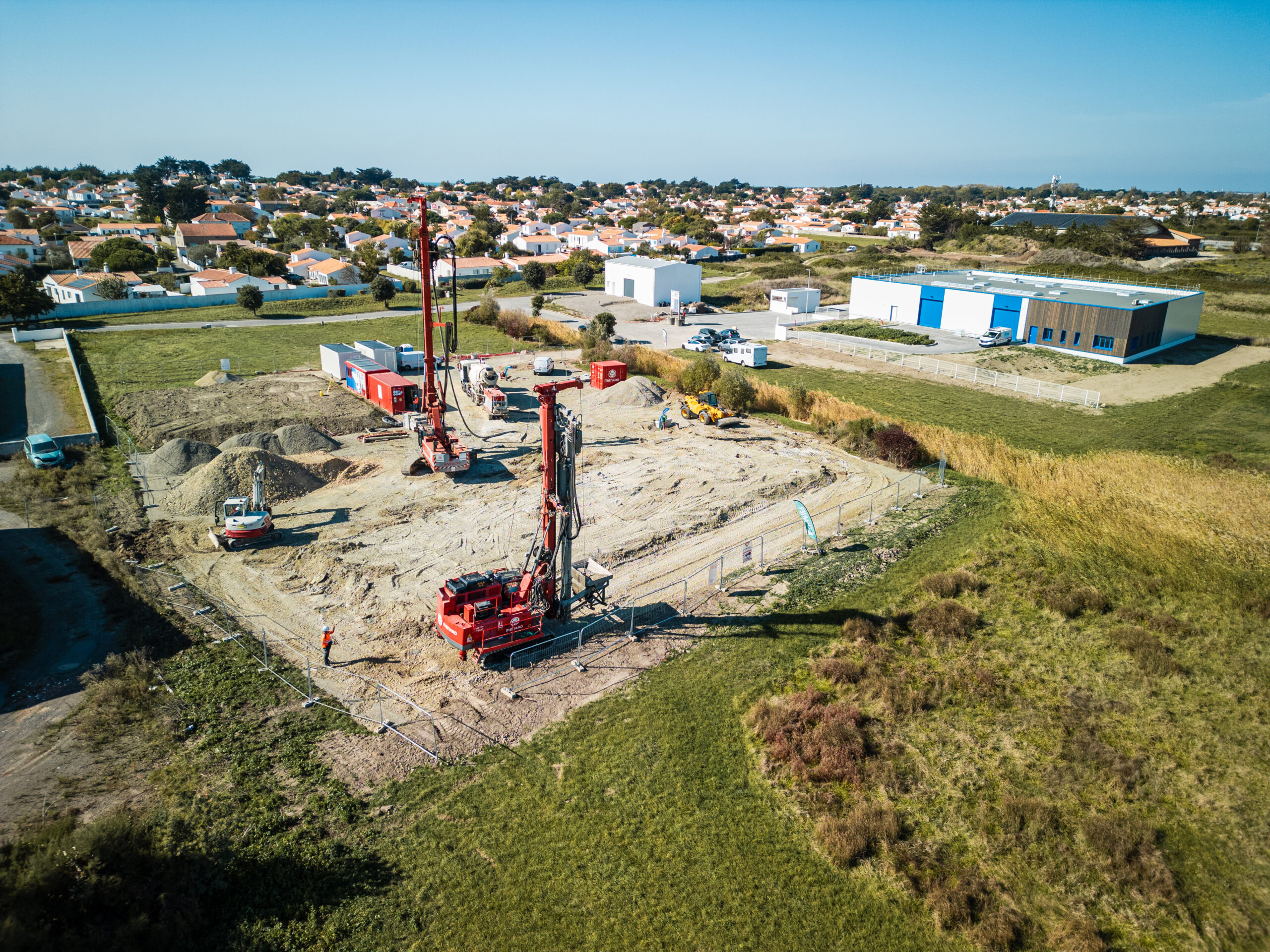 Dans ce projet de grande envergure, pour offrir un maximum de flexibilité vis-à-vis des conditions de sol et des contraintes d’exécution, deux machines de colonnes ballastées sont mobilisées. Une foreuse compacte à mât court (SPD) permet d’atteindre un niveau de production maximal de jour, et une foreuse traditionnelle (Enteco E500) atteint des profondeurs plus importantes de nuit.